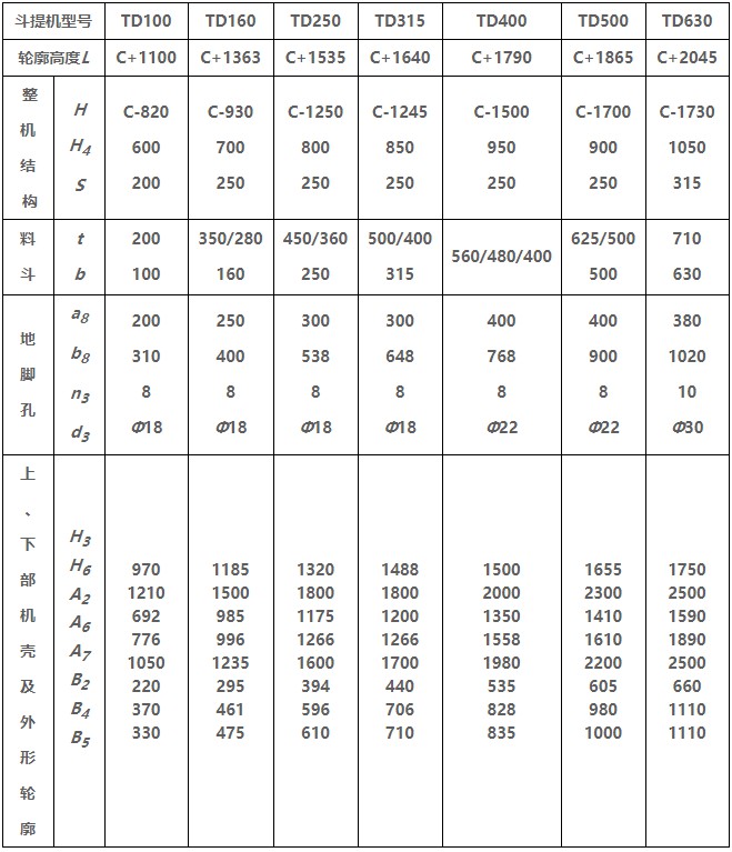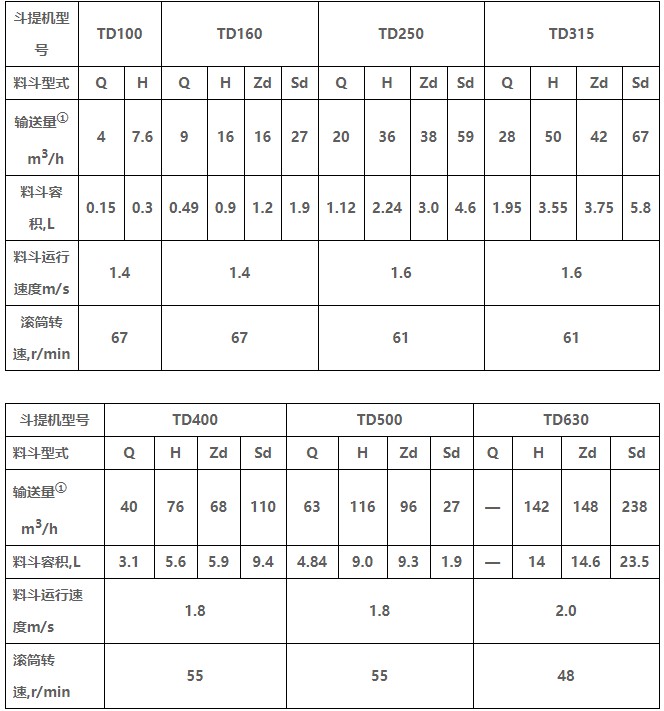 TD型垂直斗式提升機由運行部分(料斗與牽引膠帶)、帶有傳動滾筒的上部區(qū)段、帶有拉緊滾筒的下部區(qū)段、中間機殼、驅動裝置、逆止制動裝置等組成,適用于向上輸送松散密度ρ<1.5t/m3粉狀、粒狀和小塊狀的無磨琢性和半磨琢性散狀物料,如煤、砂、焦末、水泥、碎礦石等。本機的特點為快速離心卸料:并采用橡膠輸送帶為牽引構件,故不適于輸送大塊磨琢性及掏取阻力大的物料。被輸送物料的溫度不得超過60℃,如采用耐熱橡膠帶時溫度不超過200℃。與D型斗式提升機相比,具有輸送效率高,料斗型式多等特點。